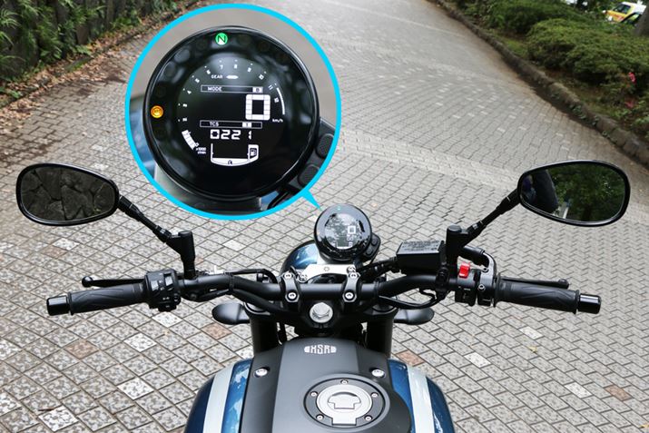 オーソドックスなパイプハンドルにメーターが配置されたシンプルなコクピット。D-MODEの走行モードやTCSの効きはメーターパネルに表示される