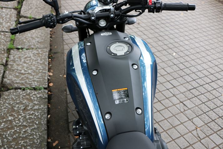 アルミ製のカバーで左右から覆い、黒い樹脂パーツでつなぎ合わせたタンクは、デザインのキーポイントの1つ。ヘアライン加工を一度施してから塗装するという手間がかけられている
