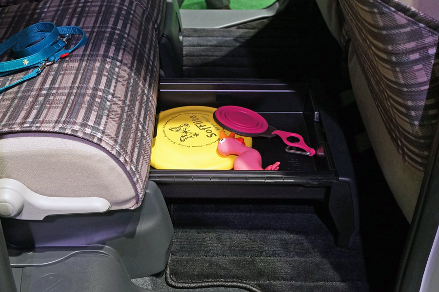 2列目シート下に備わる「置きラクボックス」。床に置きたくはないが、シート上では不安定になる荷物を運ぶ場合に便利だ