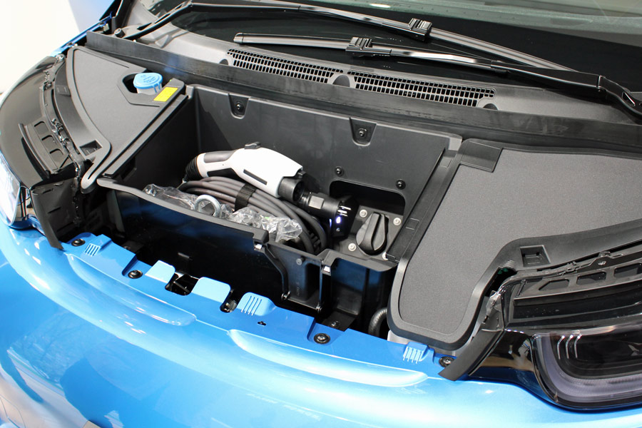 ボンネット内にある充電ポートは、家庭でも利用できる200Vの通常充電用で、約12〜13 時間でフル充電となる