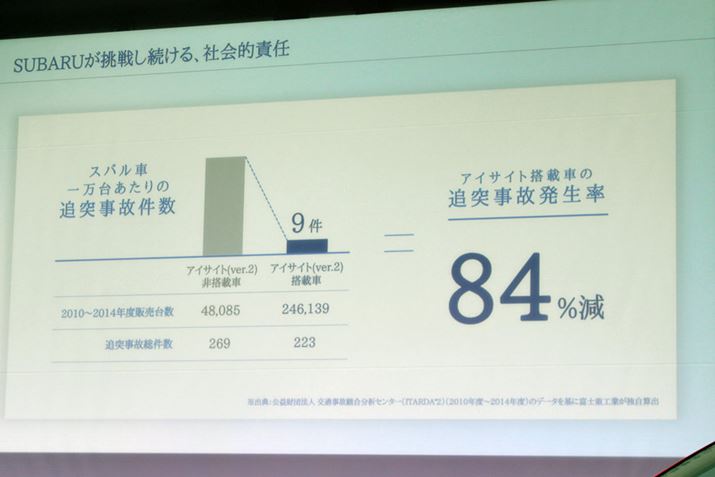 EyeSihgt ver.2を装備したクルマでは、装備しないクルマと比較して、衝突事故の発生率が84%も減少しているという