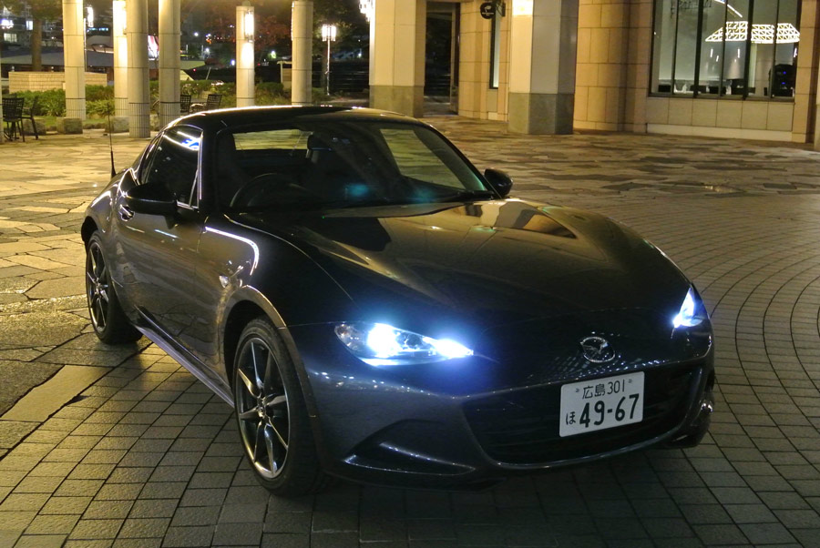 素のロードスターが1.5リッターなのに対して、ロードスターRFには北米仕様と同じ最高出力116kW(158馬力)/最大トルク200Nmの2リッターエンジンが搭載されている。これに組み合わせた6速ATは、1.5リッターよりも太いトルクを使って早め早めにシフトアップさせてゆく。ソフトトップよりも重量が増えたとはいえ、ロードスターRFの重量は1130kgしかない。3000回転あたりを使いながらも、夜の首都高速の流れを簡単にリードしていく。意外と速いのだ。ステアに対するクルマの動きは、通常のロードスターよりも穏やかだ。専用のボディ補強やパワステや足回りのセッティングもあってか、ヒラヒラという軽快感よりもドッシリとした落ち着いたフィーリングが強い。