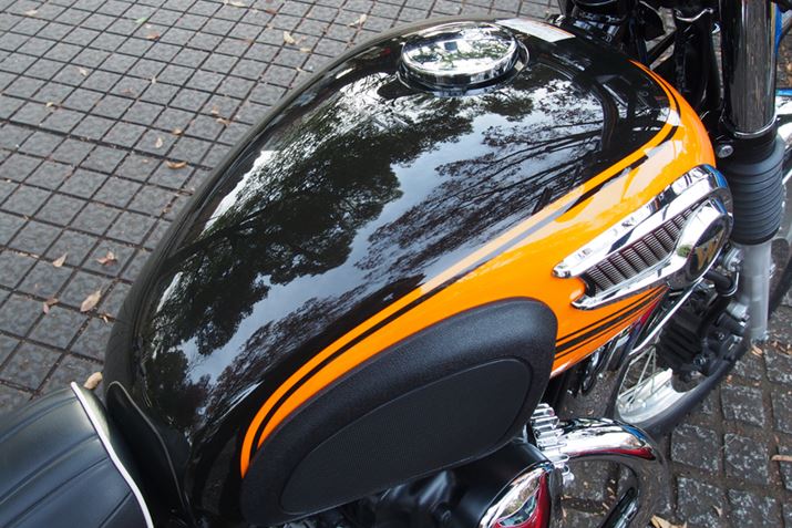 タンクには、クロームメッキが施されたエンブレムを装備。膝が当たる部分にはニーパッドが用意されている
