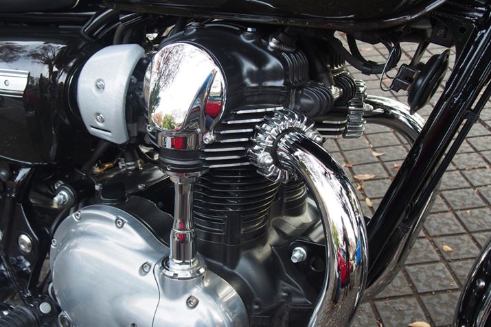 振動低減のためのバランサーを装備し、カムはベベルギア(傘型の歯車)によって駆動させる現代的なエンジンだが、空冷フィンの刻まれたエンジンがレトロな雰囲気を高めている。なお、エンジンの最高出力は48PS/6,500rpmで、最大トルクは6.5Nm/2,500rpm