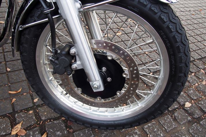 ブレーキはシングルディスクだが、車重が216kgと軽めなので制動力は必要にして十分。タイヤサイズは前が100/90-19、後ろが130/80-18となっている