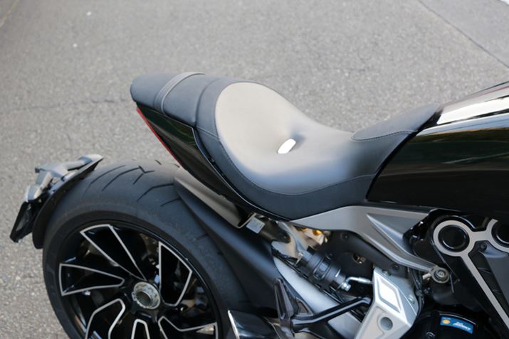 数多くのレースで輝かしい実績を残し、スポーツタイプのバイクにおいては確固たる地位を築いているドゥカティだが、近年はクルーザー的な車種にも力を入れている。2011年には、アップライトなポジションでツーリング向きの「Diavel」シリーズをリリース。ドゥカティにしては長めのホイールベースとなっており、コーナーでの運動性能よりも直線での安定性を重視した設計とされた。そして2016年に投入されたのがフロントフォークを寝かし、もっとクルーザー的なキャラクターを強めた「XDiavel」だ。車体はさらにさらに長く伸ばされ、ホイールベースは同社歴代モデルでも最長となる1,615mm。着座位置も低く、ステップは前方に配置されるなど、明らかに直線的な道を走ることを重視した車体設計となっていた。そんな「XDiavel」の中でも、今回紹介する「XDiavel S」は専用のアルミ鍛造ホイールやブレンボキャリパー、それに各部の光沢ペイントなど質感を高めたモデルとなる。