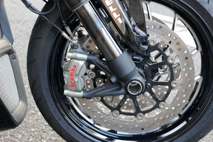 大パワーに対応するため、ブレーキには同じイタリアブランドであるブレンボ製のラジアルマウントキャリパーを採用。制動力が高いだけでなく、レバータッチやコントロール性にもすぐれる