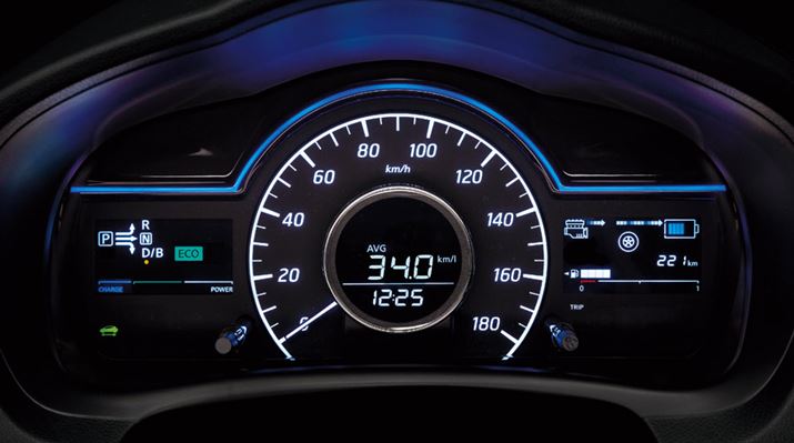 電気自動車らしさを演出したブルーを基調にしたインパネ。発電状況やバッテリーおよびガソリンの残量などが見える