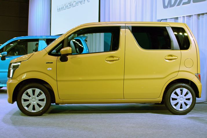 ワゴンRらしい側面のプロポーション。ボディの四隅ギリギリに配置されるタイヤが、伸ばされたホイールベースを物語っている