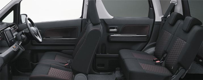 「ワゴンRスティングレー」も内装はブラックだが、赤のアクセントカラーがちりばめられており、エクステリアに負けない力強さがある