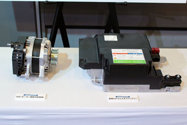 マイルドハイブリッドのコアとなる「ISG」(写真左)と、リチウムイオンバッテリー(写真右)。減速して13km/h以下になった場合や、停車からの発進時に最長10秒間のモーターによるクリープ走行が可能など、モーターの使用領域が広がった