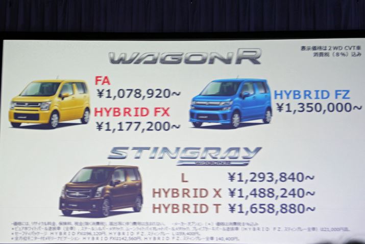 ワゴンRのモデル構成と価格。エントリーグレードのFAが107万8920円から。ワゴンRとワゴンRスティングレーにはそれぞれ3グレードが用意される(文章中および写真の価格はいずれも8%の消費税込み)