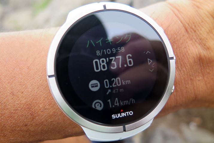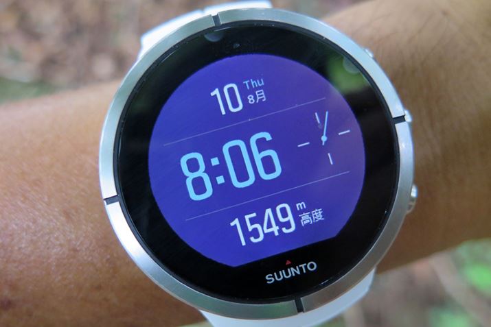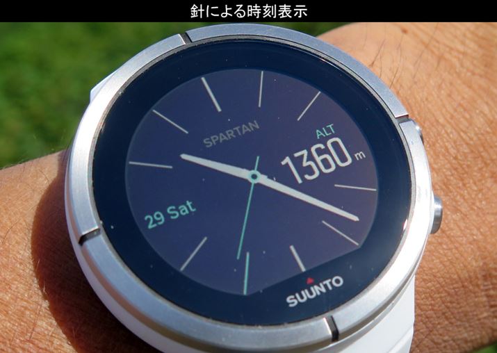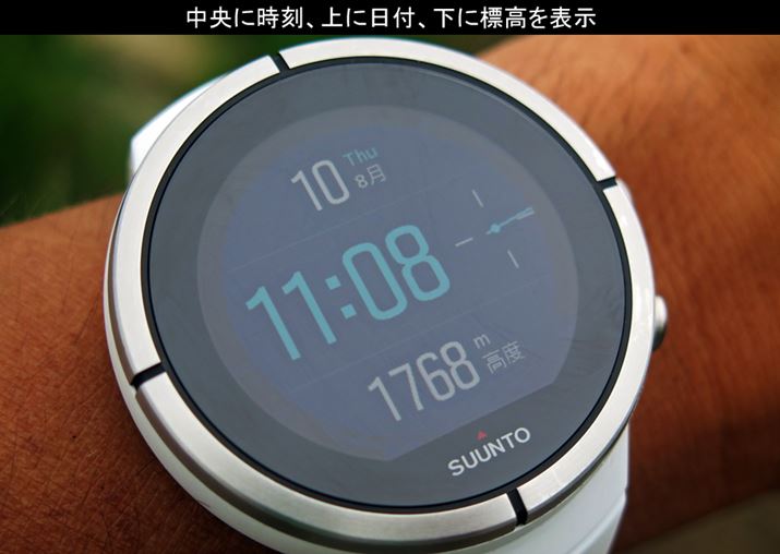 シンプルな、針による時刻表示。右側に標高も表示されているが、時間が経つと消え、さらにすっきりとした見た目になる