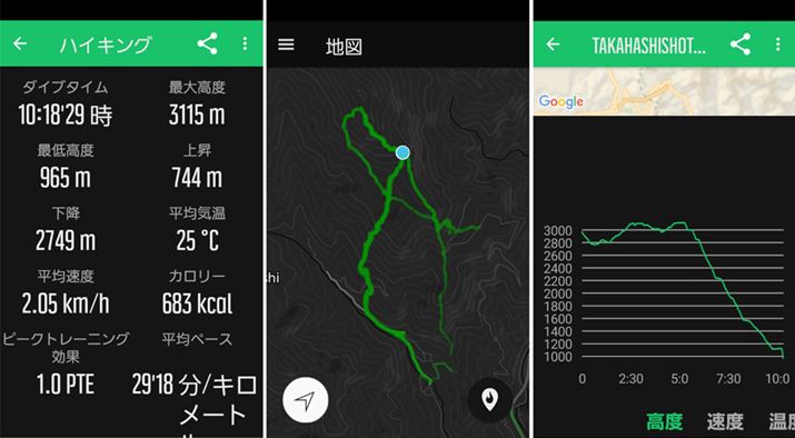 行動中にスマートフォンで確認できるデータの1例。左は行動時間や高度、気温などが網羅された数値のデータで、中央は現在地の周囲での人気コースを教えてくれるヒートマップといわれる地図。右は時間に行動時間にともなう標高の変異を示している
