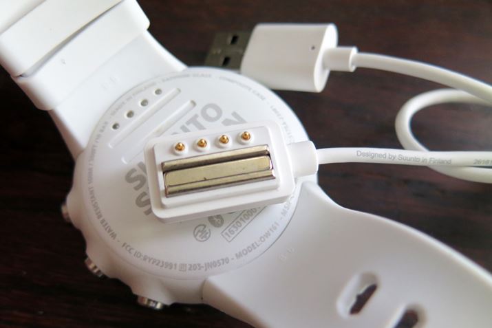 充電は付属のUSBケーブルで行う。スマートウォッチに接続する端子はマグネットで本体にカッチリと組み合い、外れにくい。以前からスントではUSB充電のモデルを出しているが、それらよりも格段に接触がよくなり、スムーズに充電できるようになった。データの移管もこのケーブルで行なえる