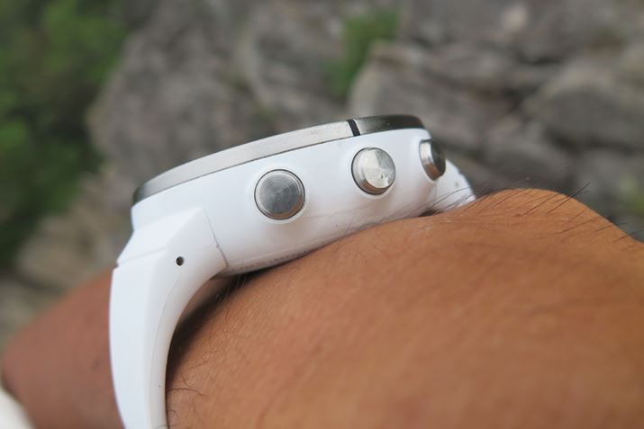 このように手首を曲げた時、リストウォッチによっては手の甲でボタンを押してしまい、思わぬ誤作動を起こすことが多々ある。だが「スパルタン ウルトラ ホワイト」は、まったく問題なかった。本体にある程度の厚みがあり、しかもボタンが低いので、手の甲がボタンを圧迫するほど接触しないからだろう。この点は、非常にすばらしい