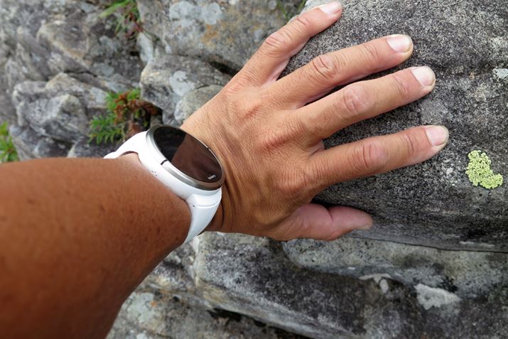 シリコンストラップは肌へのなじみがよく、フィット感も上々。腕につけてもそれほど重量を感じさせない。ベゼルはチタン製だ。なお、防水性能は10気圧(水深100m)。登山中に遭遇する暴風雨程度ならば、まったく問題はない