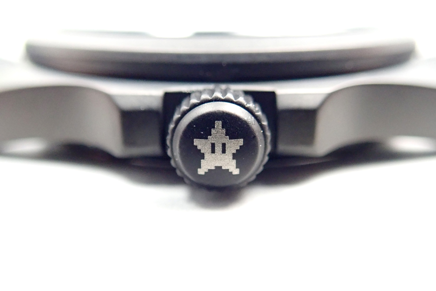 文字盤にググッと近づいて、マクロ撮影してみました。スーパーマリオの記念すべき“1-1面”のスタートを、ドット絵のまま再現しているのが、よくわかります。すべてのプレイヤーが、一度はここで、このクリボーにぶつかったはず! 秒針には、マリオを一定時間無敵の状態にするスターが付いていました