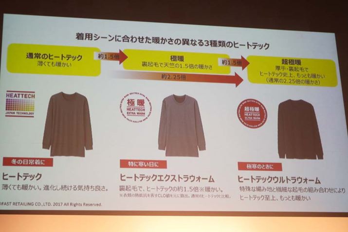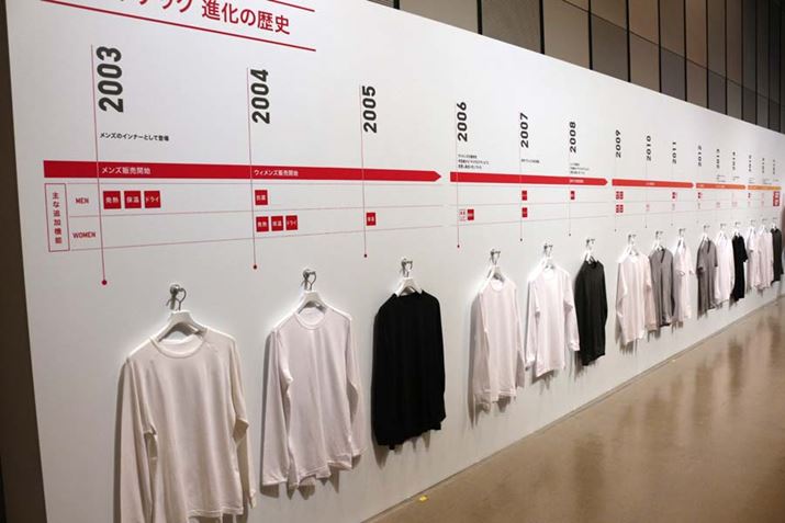 会場には、2003年発売の初代から2017年発売の最新モデルまでのヒートテックがズラリ。初代と最新をさわり比べてみると、なめらかさが全然違う! 2003年当時はメンズラインのみの販売で、機能も「発熱」「保温」「ドライ」のみだったそうです