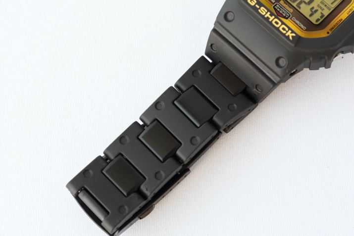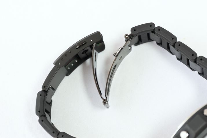 外装面で進化した点は、バンドに最新素材「ファインレジン」を組み合わせたところ。「ファインレジン」は軽量かつ耐久性の高いナイロン系樹脂で、新たなタフネスを実現するために「G-SHOCK」のハイエンドモデルを中心に利用される機会が増えている。中駒は純正の「ファインレジン」、外駒はメタルパーツを「ファインレジン」で包んだ構造だ。見た目には確かな質感があるものの、実際に持ってみると驚くほどの軽さで、長時間の利用でも疲れを感じにくかった。