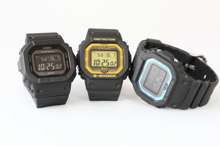 ラインアップは3種類で、左から「GW-B5600BC-1BJF」「GW-B5600BC-1JF」「GW-B5600-2JF」。なお、1番右の「GW-B5600-2JF」は「ファインレジン」製バンドではなく通常の樹脂製バンドが使われていて、価格も抑えられている