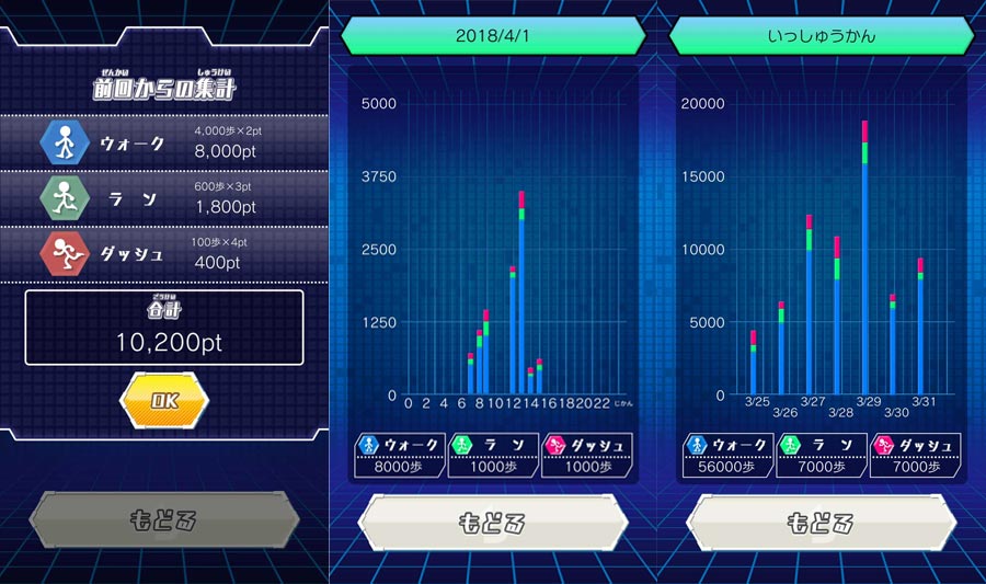 動いた速度が高いほど、ポイントは高くなる。また、運動量は24時間と1週間でグラフ化される