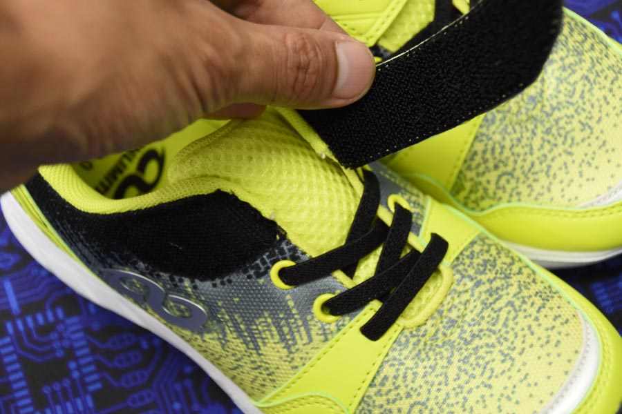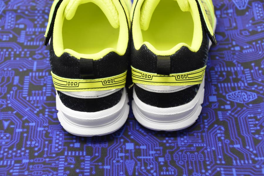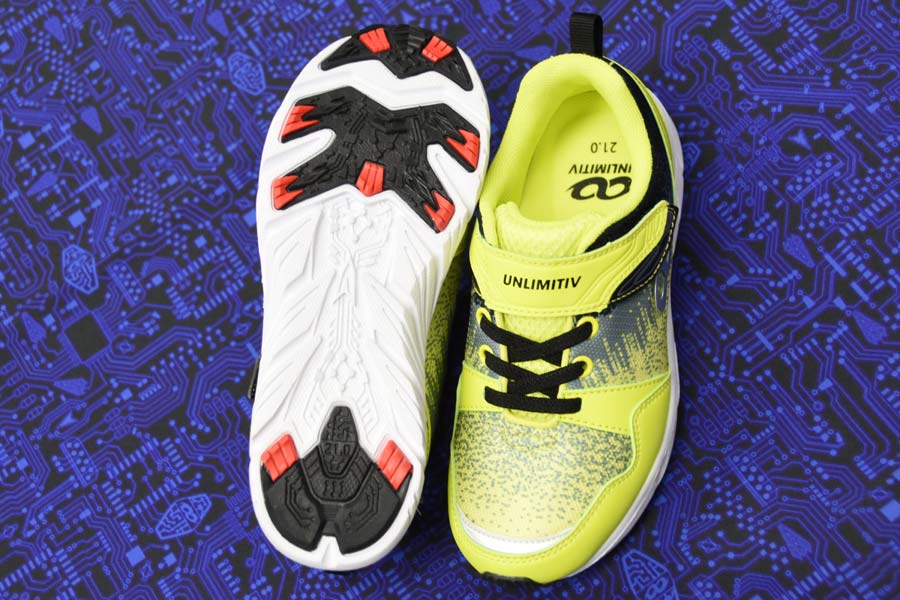 「アンリミティブ」の本体デザインや機能には、恐竜のイメージを採用。ソール側面の「ジャバラ構造」は、「ティラノサウルス」をモチーフにしており、柔軟性に富むため可動域が広い。アウトソールは最速の恐竜といわれる「オルニトミムス」のかぎ爪をモチーフに、グリップ力の高い構造に仕上げている。なお、バンダイとしては、小学生のシューズを購入する両親が子どもに履いてもらいたくなるように、大人のランニングシューズのトレンドをデザインに採り入れているという。