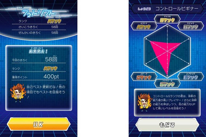 トレーニングメニューは、「フットリフト」と「クイックリアクション」のほか、俊敏性を測定する「サイドアジリティ」や体幹力を測定する「バック&ゴー」、持久力を測定する「ダッシュスクワット」、跳躍力を測定する「スプリングジャンプ」が用意される。測定後は、各項目の実力がひと目でわかるパラメーターが表示される