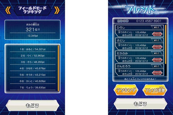 運動測定値の結果をランキング表示。「全体」「学年別」「地域別」「地域×学年別」のランキングが表示できる。また、運動データや獲得ポイントを共有できる「フレンド」は、ID検索で行える