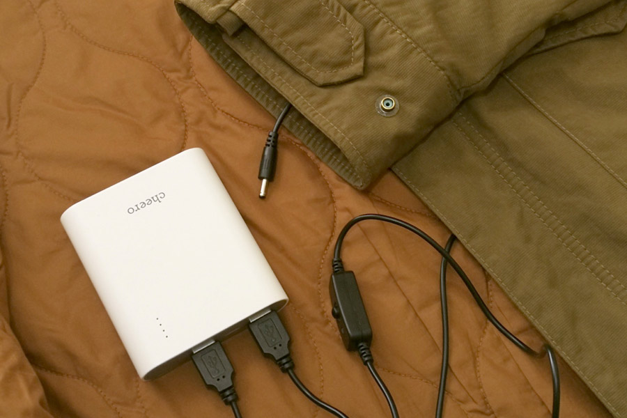 そこで、モバイルバッテリーを上着の内ポケットに収納して、ケーブルは両袖の中を通して手首まで延ばすことにしました。ケーブルの先端をつまみながら腕と一緒に袖を通してもいいですし、あらかじめケーブルだけを通しておいてもいいでしょう。