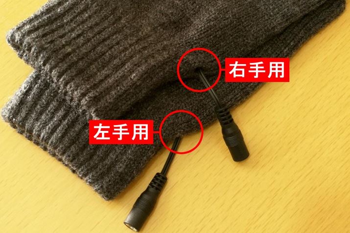 内容物はヒーターを内蔵した手袋が1組と、スイッチ付きのUSBケーブルが2本。なお、ニット手袋には左右の区別がない製品もありますが、「USB指までヒーター手袋2」は右手用と左手用が明確に分かれています(詳しくは後述)。ケーブルは2本とも同じものなので、左右の区別はありません。