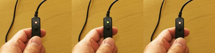 給電状態でケーブルのスイッチを押すと、ランプが赤色に点灯しました。さらにスイッチを押していくと、緑色、赤と緑の同時点灯、再び赤色……といったように、「赤」「緑」「赤と緑」の順にループします。