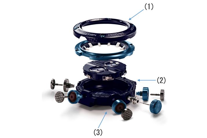(2)が、ケースと裏ブタの継ぎ目がない「カーボンモノコックケース」。金属代替樹脂として使用されるカーボン繊維強化樹脂を使用している。ちなみに、(1)は「カーボン積層ベゼル」で、(3)はボタンの強度と押しやすさが向上した「ボタンガードレスデザイン」