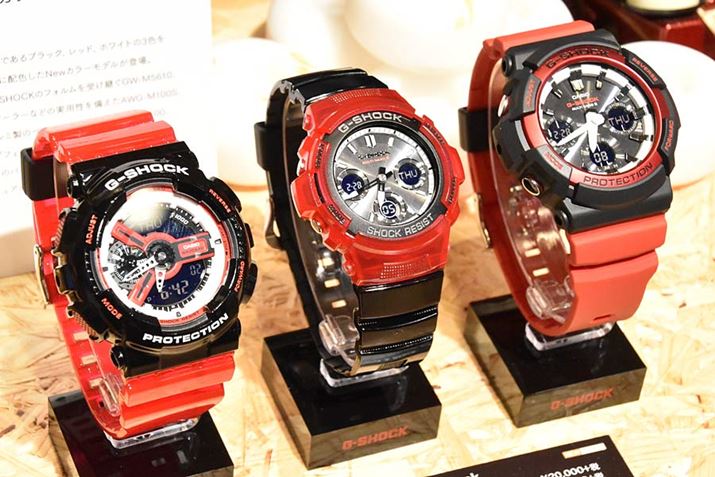 左から、ビッグフェイスの「GA-110RB-1AJF」(税込17,280円)、「AWG-M100SRB-4AJF」(税込27,000円)、「GAW-100RB-1AJF」(税込27,000円)