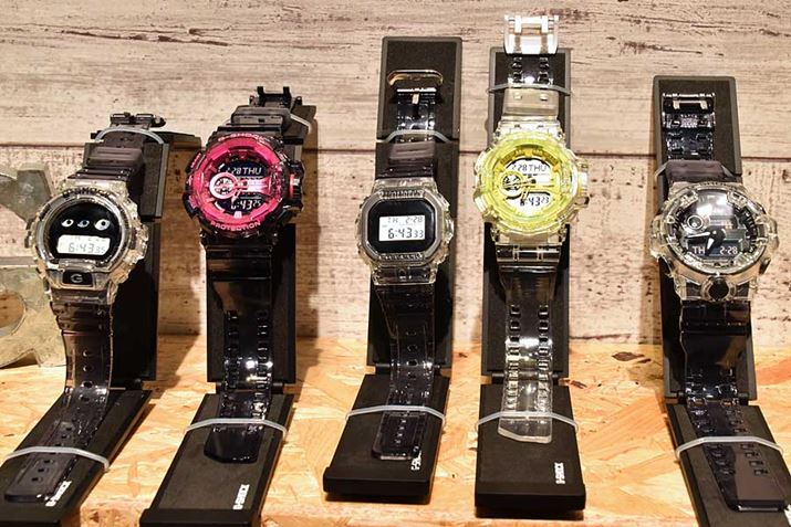 左から、「DW-6900SK-1JF」(税込13,500円)、大型竜頭を搭載した「GA-400SK-1A4JF」(税込18,360円)、「DW-5600SK-1JF」(税込13,500円)、「GA-400SK-1A9JF」(税込18,360円)、エッジを効かせたダイナミックなスタイリングの「GA-700SK-1AJF」(税込16,740円)