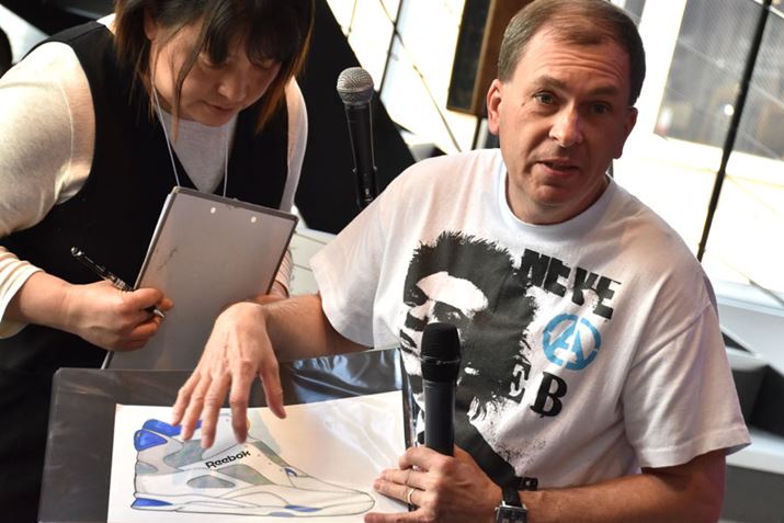 「Reebok 90s House」プレス向け内覧会でトークショーに登壇したスティーブン・スミス氏。ニューバランスのクラシックモデルの名作「574」「576」「996」「1500」、さらにはアディダス「ファントム2」やナイキの「Air Max 2009」「スピリドン」「ショックス モンスター」なども彼がデザインを手がけました