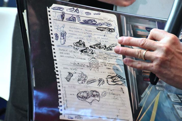 当時「INSTAPUMP FURY」のデザインのアイデアをメモしたノート。スミス氏が「自動車でいう『コンセプトカー』のようにリーボックの技術をすべて詰め込んだ」と言うように、ノートにはクルマの絵も描かれている。ちなみに、スミス氏は大の「ハローキティ」好きだとか