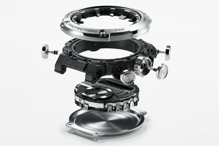 「GST-B200」の「カーボンコアガード構造」。ベゼル下のケースにカーボン繊維入り「ファインレジン」を使用している