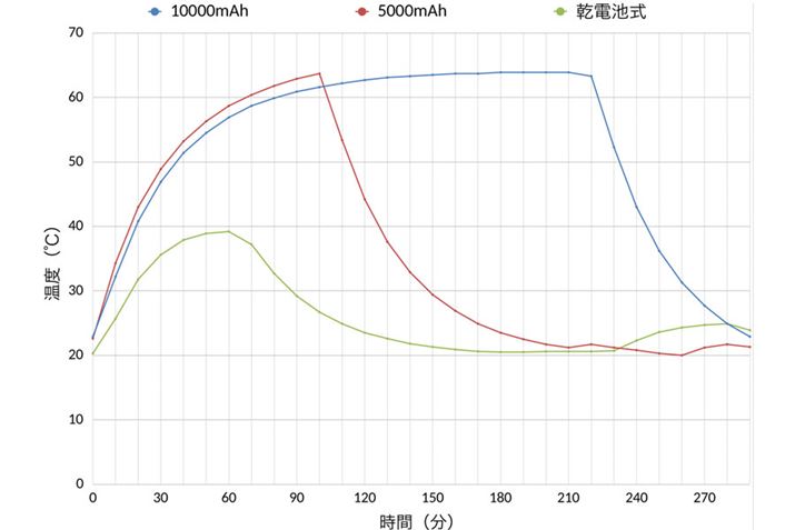 それぞれ、どのくらいの時間使用できるのか? そして温度に違いが出たりするのか? 調べてみましょう。