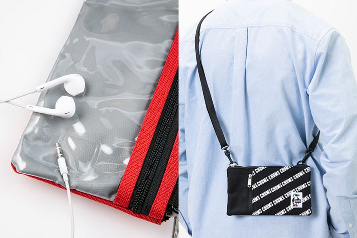スマホ用ポケットにはイヤホンコード用の穴を装備(写真左)。肩にかけて小物をコンパクトに持ち歩ける(写真右)