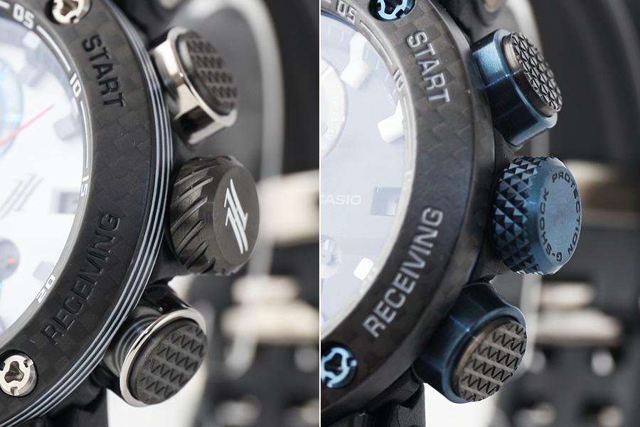 リューズやボタン、ケース側面の仕上げもアレンジ。右はベースモデルの「GWR-B1000-1A1JF」