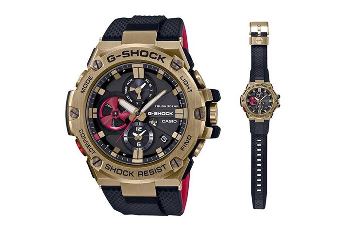 デザイン面では、異素材を組み合わせたベゼルが特徴の「G-STEEL」シリーズより、大型のディスク針を備えたアナログクロノグラフ「GST-B100」をベースモデルに採用。ブラックを基調にメタル部分にエッジの効いたゴールドIPを施し、クールな印象に仕上げている。
