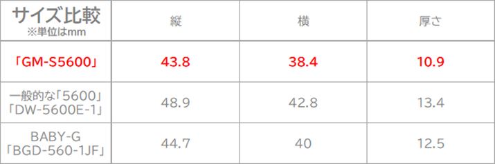 「GM-S5600」の最大の特徴は、そのサイズ感にある。デザインは、G-SHOCKファンにとって実に見慣れたスクエアフォルムだが、かなりコンパクトに仕上がっている。一般的な「5600」シリーズや、女性向けコレクションBABY-Gのスクエアモデル「BGD-560」シリーズとサイズを比較してみた。