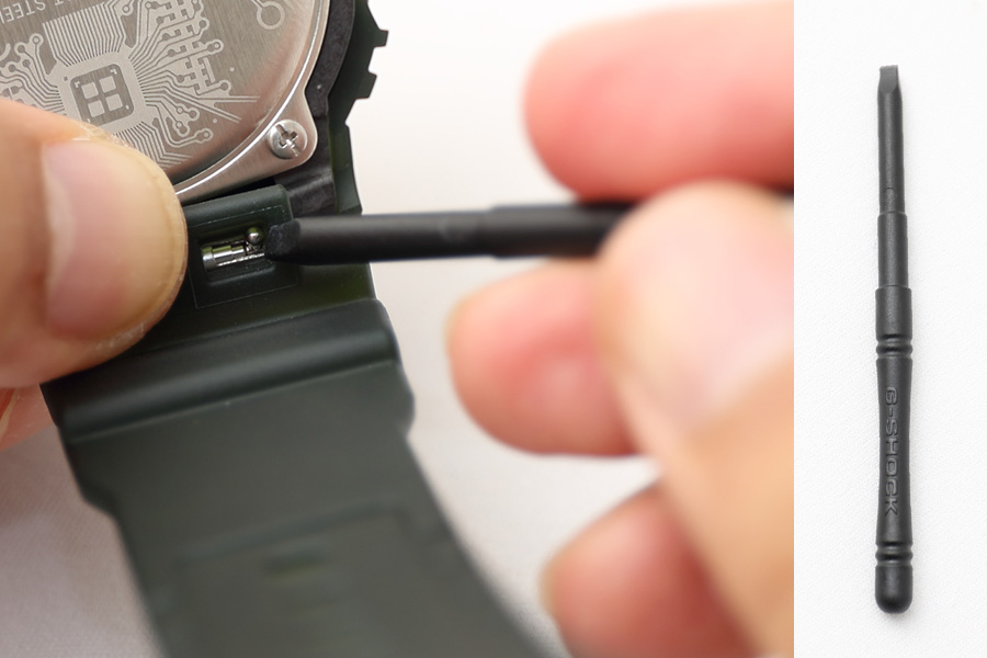 全4か所のインナーフックでベゼルを固定。ケース側面には「SHOCK RESIST」ロゴが配置されている