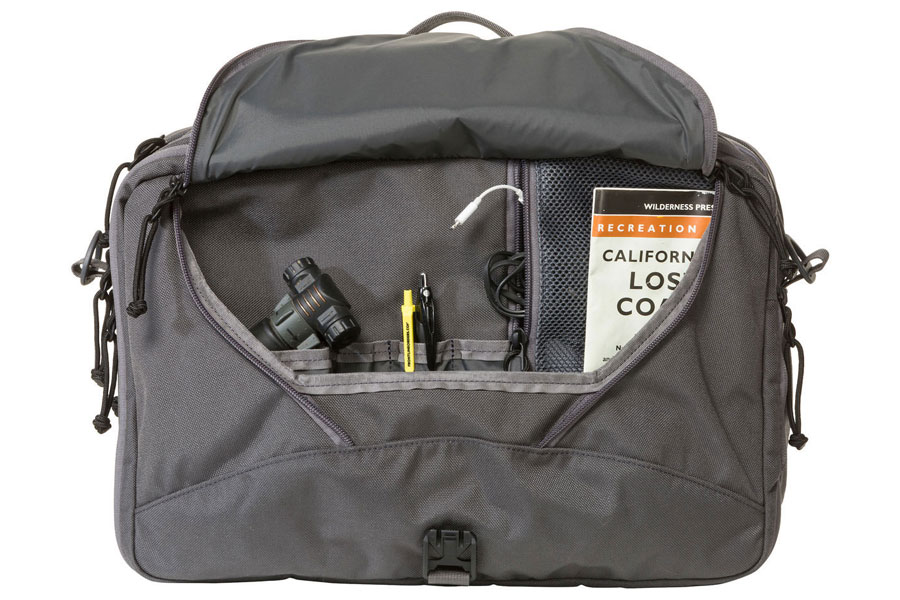 出し入れしやすいメインコンパートメントのほかに、すぐに取り出したい小物類を入れておけるフロント部分のツインポケットと、背面部分に止水ファスナーを使用したPC専用コンパートメントを完備。さらにメインコンパートメント内部にも、中身の整理に便利なオーガナイザーポケットや、雑誌やファイルを収納できるスリーブが付いているなど、使い勝手を追求した作りが最大の特徴だ。