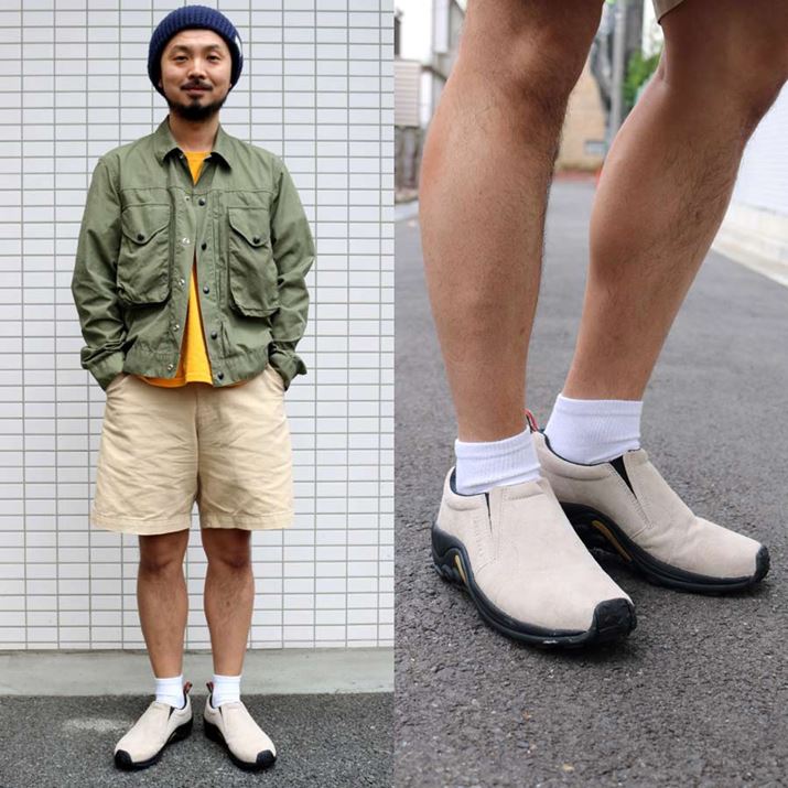 今回は足元に合わせて、若干アウトドアの匂いを感じさせるスタイルに挑戦。トップスは、モニタリーのミリタリージャケットの下にユニクロのTシャツを重ねて挿し色に。ボトムスには、軽快さを呼び込むべく、パタゴニアの「スタンドアップ・ショーツ」を合わせてみました。これに「ジャングル モック」と「ジャングル モック 2.0」をそれぞれ合わせてみると……!?
