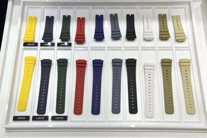 バンドのカラーバリエーションは、19種類。長いほうと短いほうで異なるカラーを選ぶこともできる。スケルトン仕様が用意されているのもうれしい