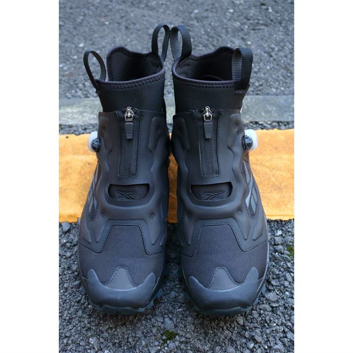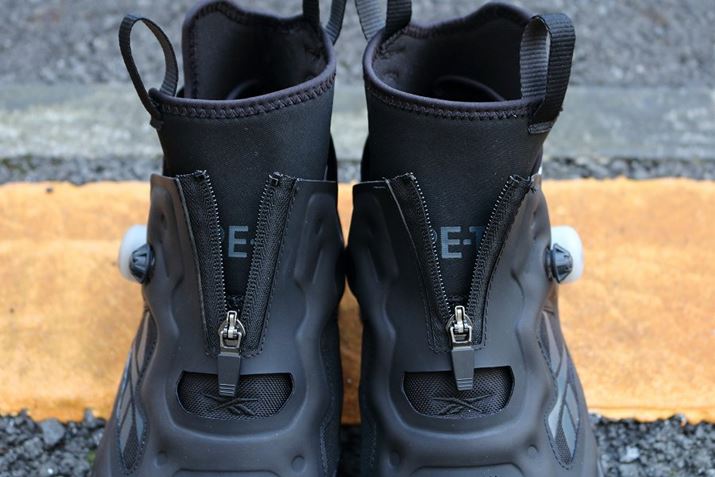 繰り返しますが、同モデル最大の特徴と言えば、アッパーに内蔵されたチャンバーに空気を注入することで、フィット感を調整する「ザ ポンプ テクノロジー」と前後独立型ソールユニット。本作でもそのDNAはしっかり継承しつつ、アイコニックなポンプボールを甲部分から側面へと移動させ、足首をスッポリと包み込むハイカットのブーツ仕様にアップデートしています。さらに、全体をブラックとグレーでまとめることで(ちなみにこちらはサンプルモデル。一般販売モデルではポンプボールもアッパーと同じブラックです)、元々の未来的デザインにタフネスなイメージを加えています。