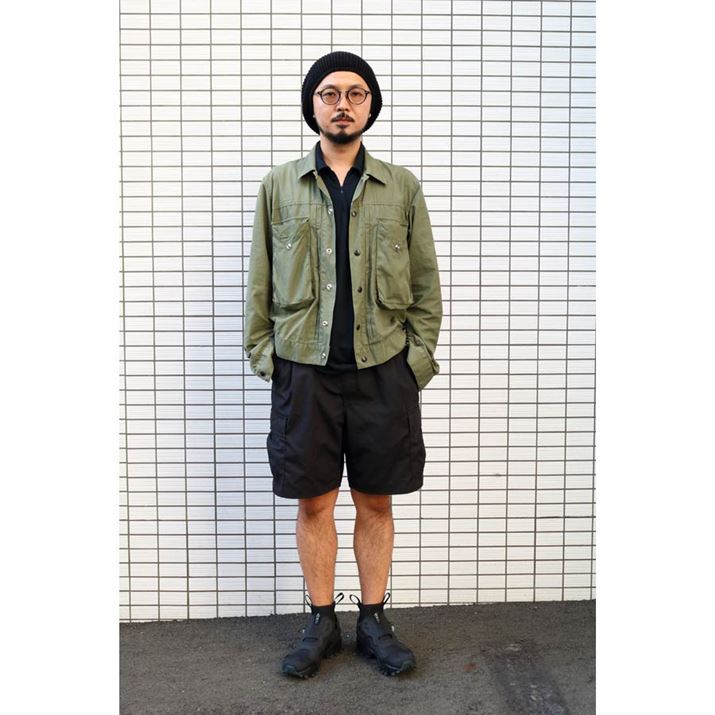 「そろそろ肌寒くなってきたし、秋にショーツはどうなの?」なんて声も聞こえてきそうですが、せっかく足元暖かな「ゴアテックス インフィニアム サーミアム インサレーション」を搭載しているのだし、“プラマイゼロ”でしょ?ってことで、ボトムスはプロッパーのカーゴショーツをセレクト。トップスは、エトスのジップポロシャツの上に、モニタリーのミリタリージャケットを羽織って、ニューエラのニットタムを着用。メガネもかけてみちゃったりして、オリーブとブラックで統一した落ち着きのある大人(40歳)を意識してみました。では、これに「インスタポンプフューリー エックス GTX」を合わせてみると……!?