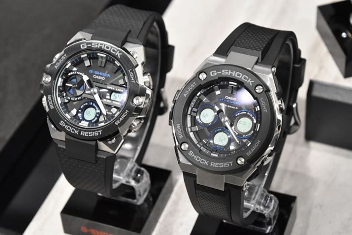 【写真上】「G-STEEL」から「GST-B400FP-1A2JR」(左/54,450円)(税込)と、「GST-W300FP-1A2JR」(40,150円) 【写真下】アナログ針とデジタル表示のコンビネーションモデル「AWG-M100SF-1A5JR」(左/26,400円)と、デジタル表示モデル「GW-2320SF-1B5JR」(右/23,100円)